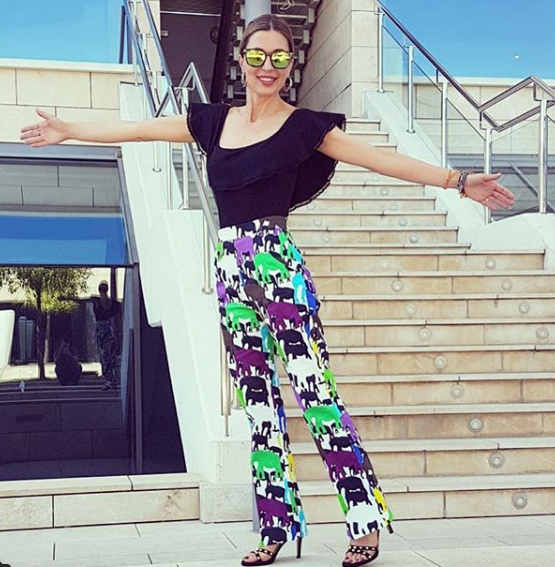 Nos sorprendió con un outfit de lo más primaveral. Unos pantalones en tonos ácidos , acompañado de un top con escote cuadrado y un volante en la zona del pecho a conjunto con los tonos azulados del pantalón.