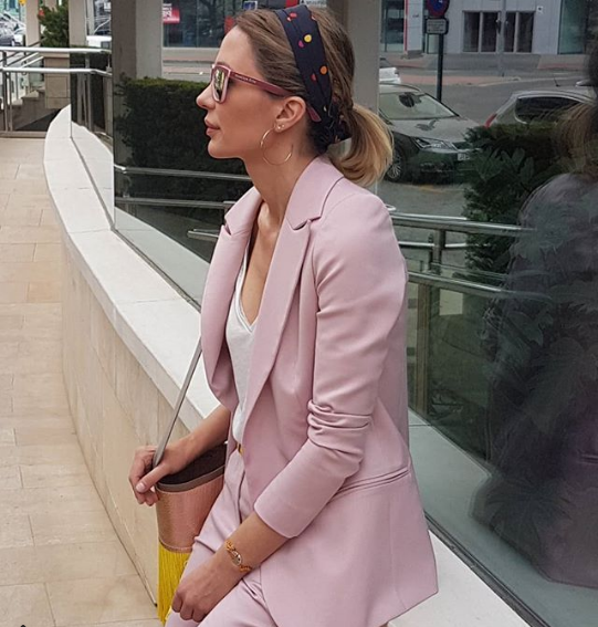 En su ultimo día como Doña Sardina, la murciana escoge un traje de chaqueta rosa palo. Combinado con una camiseta y zapatillas blancas y complementos en tono amarillo, dándole un toque informal.